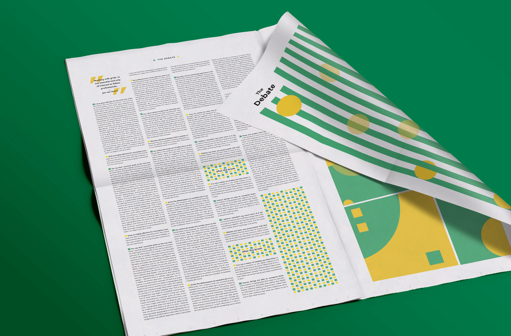 Visually express the dialogue between Wim Crouwel and Jan Van Toorn and present text in a way that is representative of each designer’s style.